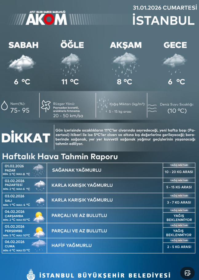 İstanbul Büyükşehir Belediyesi Afet Koordinasyon Merkezi (AKOM), İstanbul’da sıcaklıkların ciddi şekilde düşeceğini ve yağışların tür değiştireceğini duyurdu. Tahminlere göre, okulların